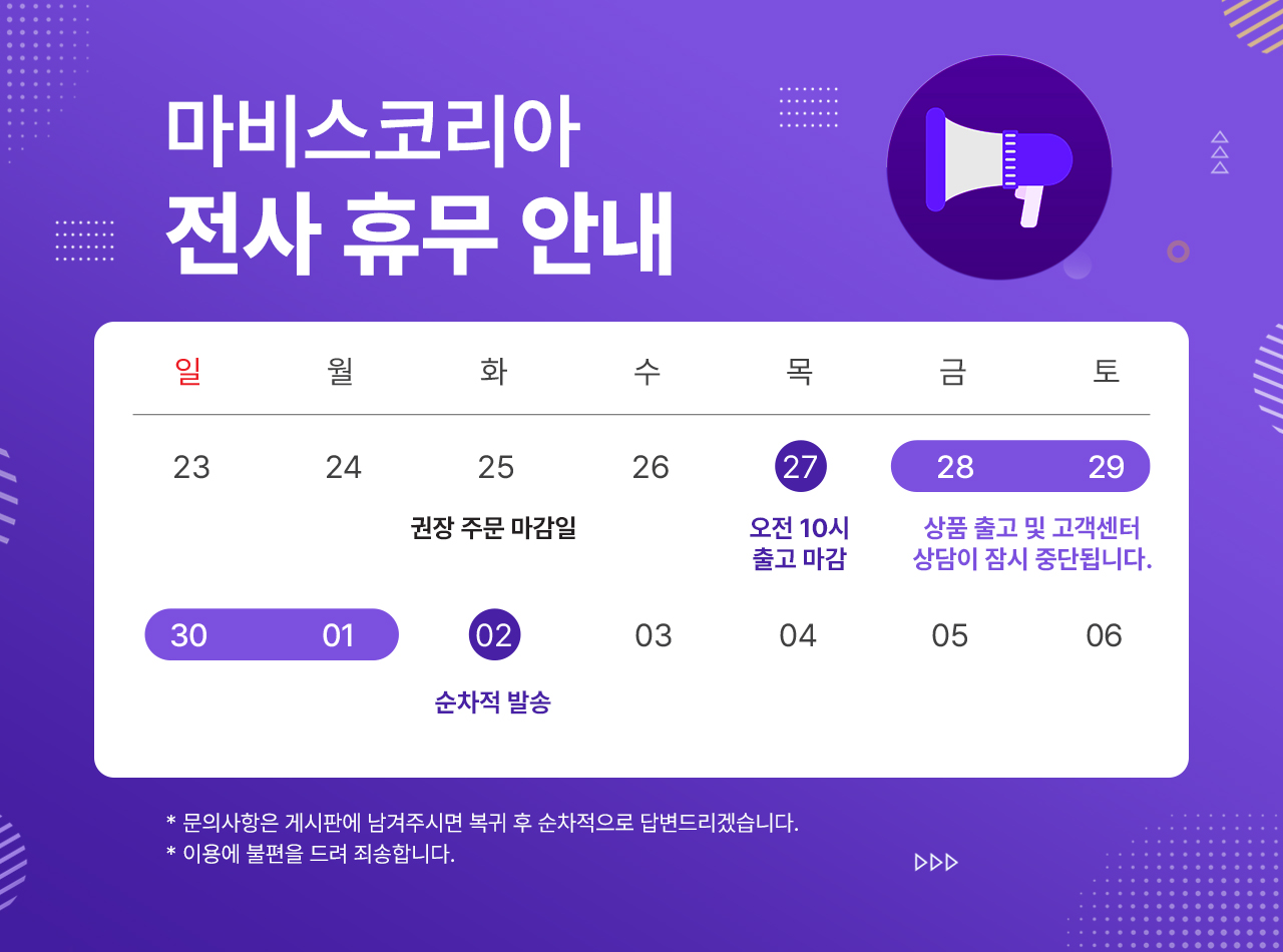 * 배송일자 : 오전 9시까지 결제 완료 시 당일 출고를 원칙으로 하고 있으며, 주말과 공휴일에는 발송되지 않습니다.